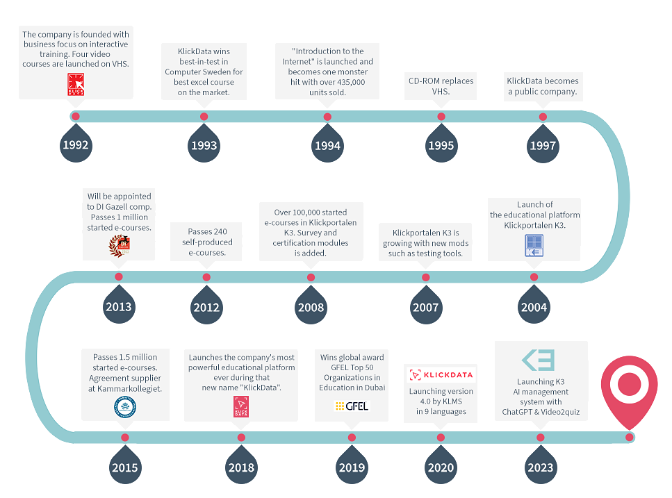 KlickData has 30 years of experience in their own- and assignment-produced e-courses. In total, there have been over 500 productions since 1992. When Klickportalen launched K3 in 2005, it was initially a gathering place for KlickData's e-courses on the web. Today, the platform K3 / KLMS is the market's most effective LMS for interactive education and the core of KlickData's operations.